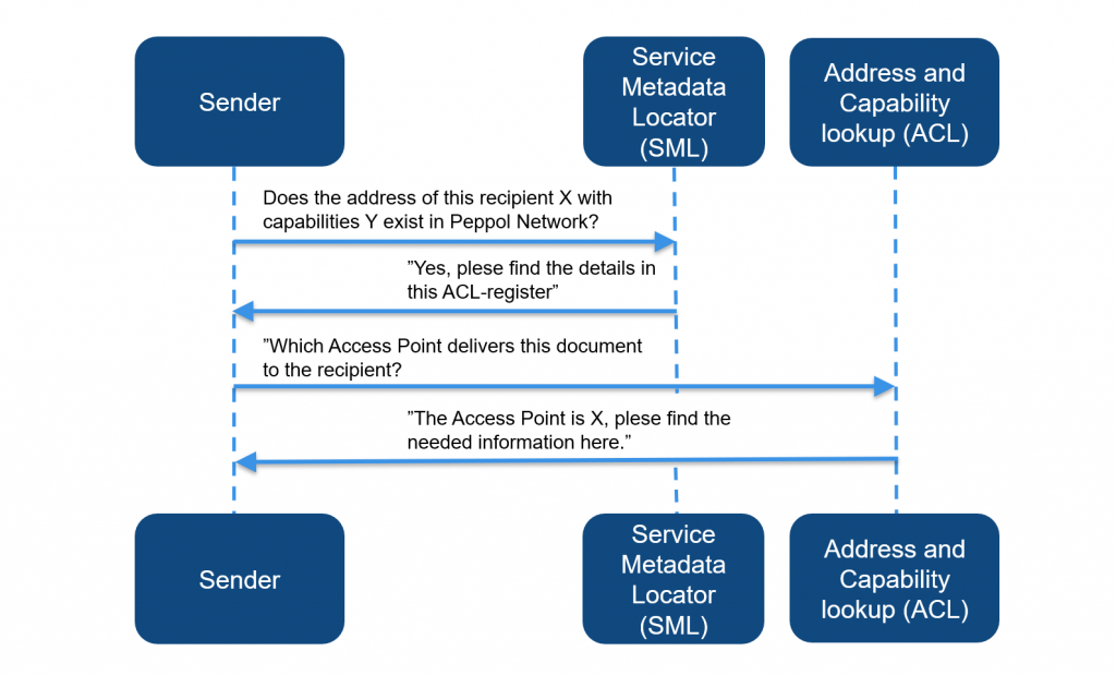 Service Providers maintain their customers’ Peppol addresses and information about which business documents they can process in the ACL service. The ACL service also contains information on which Service Provider’s Access Point the business document must technically be delivered to in order to ensure that it reaches the correct recipient. The SML service is used to determine the ACL service in which the end customer’s data are maintained. OpenPeppol maintains more detailed documentation on both ACL and SML operation.