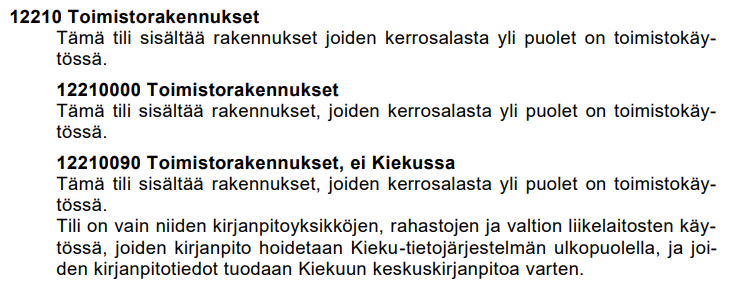 Esimerkiksi käyttöomaisuudessa Toimistorakennuksissa on käytettävä tiliä 12210090 Toimistorakennukset, ei Kiekussa (1.1.2025 voimaan tulleen tilikartan mukaan, ks. kuva 1)