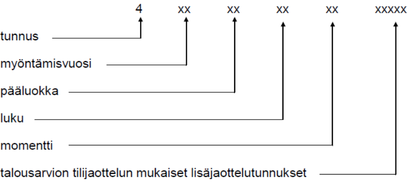 Efter det år då överförda anslag har beviljats bildas kontot från budgetkontot på följande sätt: Koden 4 och de två sista siffrorna i årtalet för beviljandet av anslaget förs in framför budgetkontot.