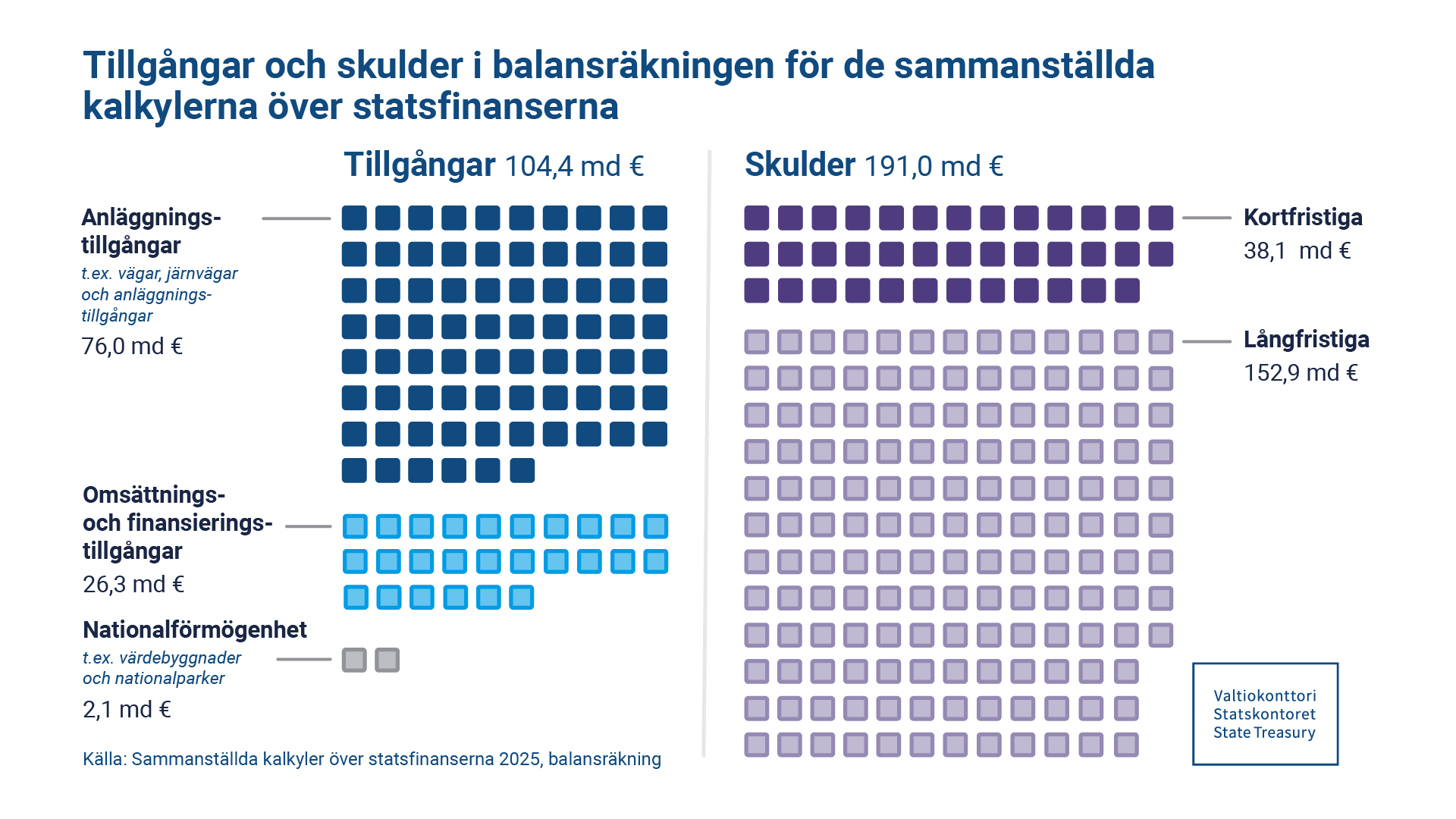 Visualiseringen grundar sig på de sammanställda kalkylerna över statsfinanserna 2025. Vid användning av material som visualiserats av Statskontoret ska ursprungskällan och materialversionens tidpunkt anges, till exempel:
