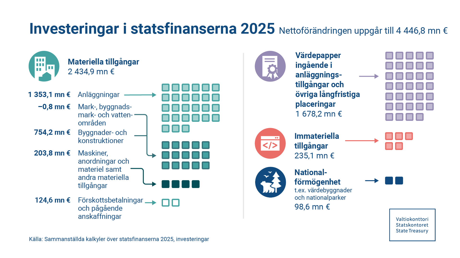 Nettoförändringen i statsfinansernas investeringar uppgick till 4 446,8 miljoner euro 2025. De största nettoökningarna gällde värdepapper ingående i anläggningstillgångarna och andra långfristiga placeringar samt konstruktioner. Bland konstruktionerna riktades de största ökningarna särskilt mot järnvägskonstruktioner.