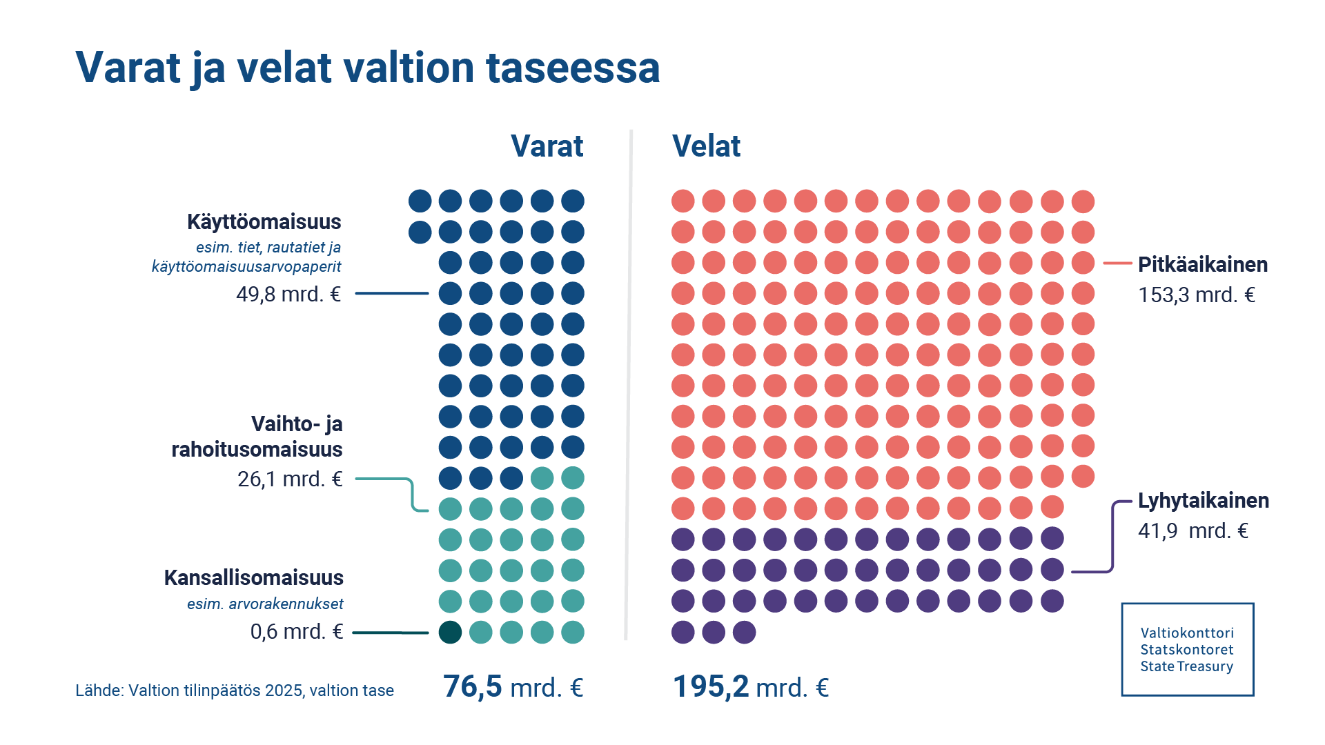 Valtion talousarviotalouden taseen loppusumma vuonna 2025 on 76,5 miljardia euroa. Tämä on noin 4,7 miljardia euroa eli noin 6,5 prosenttia suurempi kuin edellisenä vuonna. Suurin muutos taseessa oli valtionvelan lisääntyminen 17,1 miljardilla eurolla. Taseen mukainen valtionvelka on vuoden 2025 lopussa 185,0 miljardia euroa, kun se saman vuoden alussa oli 167,9 miljardia euroa. Taseen mukaisella valtionvelalla tarkoitetaan pitkäaikaisen vieraan pääoman lisäksi lyhytaikaisen vieraan pääoman eriä sekä seuraavana tilikautena maksettavia lyhennyksiä ja lyhytaikaisia euromääräisiä lainoja.