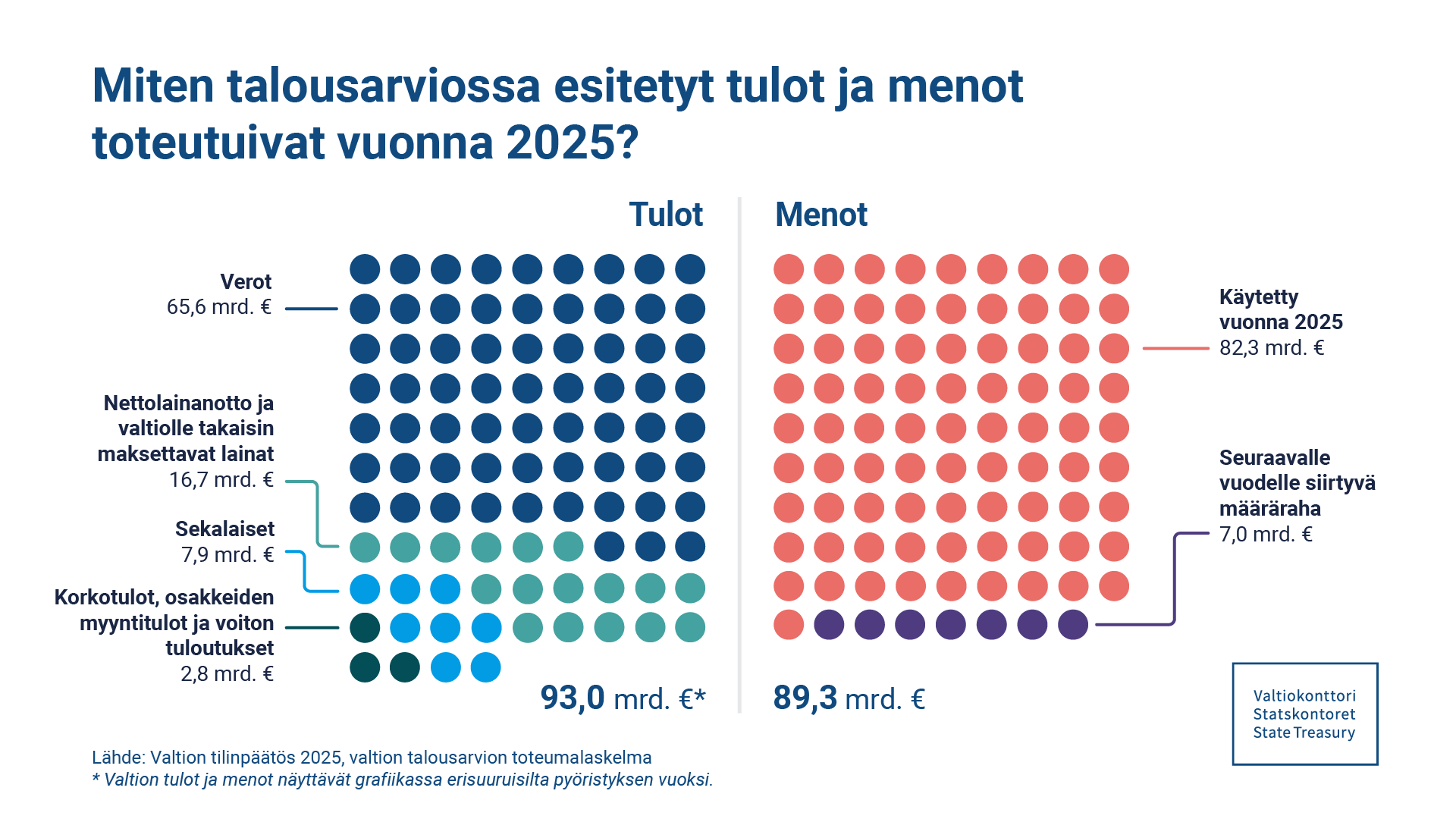 Vuoden 2025 valtion tilinpäätöksen mukaisen talousarviotalouden toteutumalaskelman ylijäämä on 3,7 miljoonaa euroa. Talousarvion toteumalaskelmalla otetut lainat käsitellään tuloina. Vuonna 2025 nettolainanotto oli 16,4 miljardia euroa.